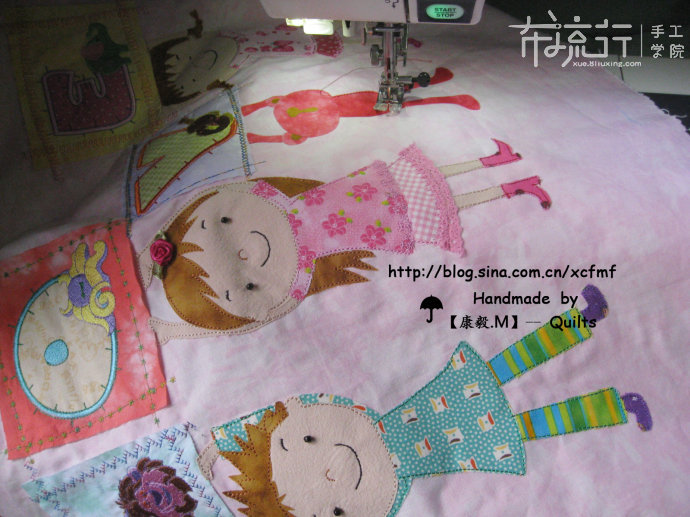 设计思想:记得2012年6月1日,很特别的日子,是六一儿童节,我独自一人去公园溜达,我遇见了世上最幸福的最可爱的三胞胎,真是人见人爱,两个女孩,一个男孩,一边在游乐园玩游戏,一边吃零吃,一边父母给孩子们照相,然后小孩子们玩完后,我主动找三个小孩子们聊天,老大女孩性格外向,爱吃零食,老二男孩性格内向,不爱说话,爱玩飞机玩具、笑嘻嘻的,老三女孩性格外向,大咧咧,爱玩芭比娃娃,爱给娃娃穿无数件衣服、小包,三个小孩子兴趣不一,大伙一起玩真是快乐极了,所以康毅灵感激发了,为感谢让我看到美好的幸福童年,为可爱的三胞胎设计吧,谁让这么好玩的小孩让我见到了呢,嘻嘻……作品采用机缝拼布与手缝拼布一起结合手法,拼布制作技术采用拼接、染布、贴布、压线、自由绣花、翻车技术等多种技术结合体表现不同的细节处理。